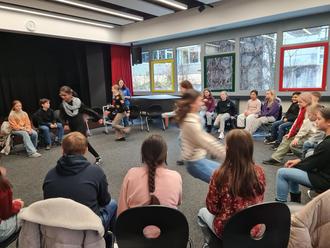 Eliévine begrüßt die Schüler schwungvoll, avec dynamisme, und steigt directement in den Spracherwerb ein. Mit einem Bewegungsspiel erlernen die Schüler in kürzester Zeit die französischen Wörter für Farben (couleur). Schon nach wenigen Minuten sind 30 Schüler lachend im Klassenraum unterwegs, nennen Farben auf Französisch und tauschen die Stühle, wenn ihre Farbkarte genannt wird. Ebenso dynamisch geht es weiter. Ein französischer Popsong wird eingespielt, ein Würfel muss weitergereicht werden, bis die Musik verstummt, dann wird gewürfelt und je nach Ergebnis ein Vorstellungssatz eingeübt. Mit spielerischer Leichtigkeit eignen sich die Schüler in kürzester Zeit Grundbegriffe an. Es wird deutlich, wie natürlicher Spracherwerb gelingen kann und dass Französischunterricht keine angestaubte Pflichtübung ist. Der Beweis gelingt Eliévine avec Bravour: Französisch lernen macht Spaß.