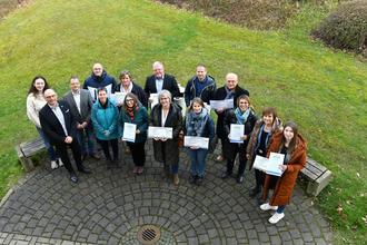 Verleihung in der Homberger Kreisverwaltung: Markus Karl Pollok (2. v. li.), Dezernent für Energie und Klimaschutz, und Tobias Rimpau (3. v. li.), Energiebeauftragter des Landkreises, zeichneten die Preisträger aus.