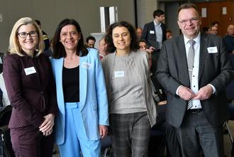 Claudia Wesner - Stabsstelle Fachkräftesicherung in Hessen, Tatjana Grau-Becker - Fachbereichsleiterin Wirtschaftsförderung im SEK, Lora Demireva und Landrat Winfried Becker