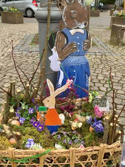 Rund um den Raiffeisenplatz zeigen sich die Bäume österlich geschmückt.