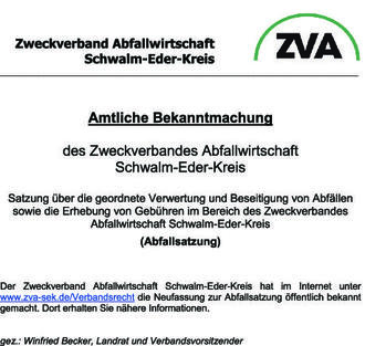 Amtliche Bekanntmachung des Zweckverbandes Abfallwirtschaft Schwalm-Eder-Kreis - Neufassung der Abfallsatzung