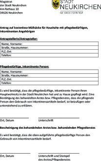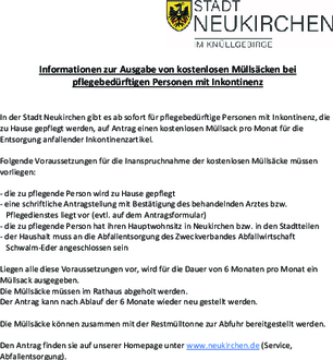 In der Stadt Neukirchen gibt es ab sofort für pflegebedürftige Personen mit Inkontinenz, die zu Hause gepflegt werden, auf Antrag einen kostenlosen Müllsack pro Monat für die Entsorgung anfallender Inkontinenzartikel.