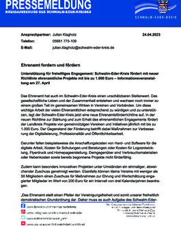 Das Ehrenamt hat auch im Schwalm-Eder-Kreis einen unschätzbaren Stellenwert. Das gesellschaftliche Leben und der Zusammenhalt entstehen und wachsen noch immer zu einem großen Teil im gemeinsamen Wirken in Vereinen und Verbänden. Um diese wichtige Arbeit der vielen Ehrenamtlichen entsprechend zu würdigen und zu unterstützen, legt der Schwalm-Eder-Kreis jetzt eine neue Ehrenamtsförderrichtline auf. In der neuen Richtline zur Stärkung und zum Erhalt des ehrenamtlichen Engagements fördert der Landkreis Projekte von gemeinnützigen Vereinen und Initiativen jährlich mit bis zu 1.000 Euro. Der Gegenstand der Förderung betrifft dabei Maßnahmen zur Verbesserung der Digitalisierung, Professionalität und Öffentlichkeitsarbeit.