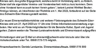 Zur neuen Ehrenamtsförderrichtlinie und weiterer Förderangebote des Schwalm-Eder-Kreises wird am 27. April 2023 ab 17 Uhr eine Online-Informationsveranstaltung angeboten.