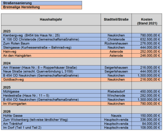 Die Stadtverordnetenversammlung beschließt das Straßensanierungskonzept 2023 – 2032 für die nachstehend aufgeführten Straßen (Straßensanierung + Erstmalige Herstellung). In Abstimmung mit den Stadtwerken ist vor Planungsbeginn zu prüfen, inwieweit Abwasser- und Trinkwasserleitungen zu erneuern sind.