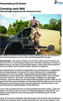 Ein ultraelastischer Camperfilz, Schafswolldämmung, Standheizung, handgefertigte Aluminiumduschtassen sind gemacht für manch Abenteuertrip im ausgebauten Camper oder Truck. Den beiden Jungunternehmern bleibt aufgrund der hohen Nachfrage momentan selbst zwar wenig Zeit für Abenteuerreisen, doch sie wissen, worauf es ankommt. „Wir setzen auf hochwertige, langlebige und nachhaltige Produkte“, sagt Sven Bleile, der als Maschinenbauer selbst ein großer Tüftler ist und jedes Produkt auf seine Handhabe und Nutzerfreundlichkeit testet und auch nicht die Entwicklung neuer Produkte scheut. Derzeit arbeitet der Jungunternehmer an der Entwicklung eines Edelstahlträgers für Dachaufbauten.
