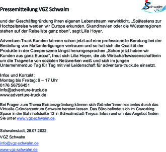 Bei Fragen zum Thema Existenzgründung können sich Gründer*innen kostenlos durch das Virtuelle Gründerzentrum Schwalm beraten lassen. Das Büro befindet sich im Coworking Space in der Bahnhofstraße 12 in Schwalmstadt-Treysa. Infos rund um das Angebot finden Sie unter www.vgz-schwalm.de.