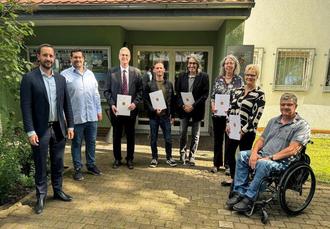 v. l. n. r. Bürgermeister Luca Fritsch, Digitalisierungsbeauftragter Jörn Szypkowski, Di@-Lotsen Manfred Eckweiler, Christian Bergmannund Reimund Siewert, Di@-Lotsinnen Roswitha Bechtel und Michaela Schügner, Digitalisierungslotse Jörg Blumenauer
