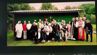 Letzten Sonntag wurde bei sehr gut besuchtem Gottesdienst feierlich Übergabe der Leitung des Knüllcamps an den Nachfolger: Pfr. Lee Nelson, Dallas, USA, und an den Assistenten Nathaniel Boonzaaijer zelebriert. Bikd zeigt einige Teilnehme mit Geistlichen und Missionsbischof Boonzaaijer aus Dallas, der im Auftrag des Erzbischof Sutton die Feier leitete.