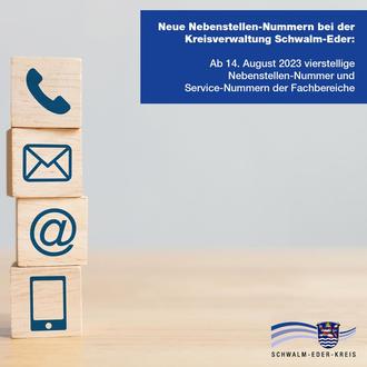 Die Kreisverwaltung Schwalm-Eder bittet darum, ab 14. August die neuen Nebenstellen-Nummern zu verwenden. Die neuen Nebenstellen-Nummern der Mitarbeiterinnen und Mitarbeiter der Kreisverwaltung Schwalm-Eder sind auf der Homepage unter www.schwalm-eder-kreis.de/mitarbeitende oder unter www.schwalm-eder-kreis.de/service ab 14. August aktualisiert und einsehbar.