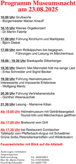 | 19:30 Uhr | Führung Heimatmuseum: interessante und imposante Erlebnisse durch Wolfgang Mantz |