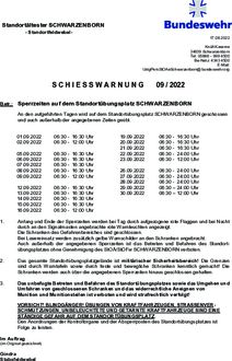 | Auch außerhalb der angegebenen Sperrzeiten ist das Betreten und Befahren des Standortübungsplatzes ohne Genehmigung des StOÄ/StOFw SCHWARZENBORN verboten. |