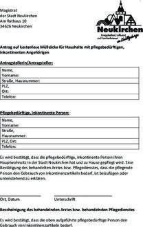 In der Stadt Neukirchen gibt es ab sofort für pflegebedürftige Personen mit Inkontinenz, die zu Hause gepflegt werden, auf Antrag einen kostenlosen Müllsack pro Monat für die Entsorgung anfallender Inkontinenzartikel.