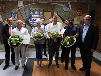 In einer kleinen Feierstunde konnten Landrat Winfried Becker und Erster Kreisbeigeordneter Jürgen Kaufmann kürzlich zwei langjährige und engagierte Mitarbeitende in den Ruhestand verabschieden und zwei weiteren zu Dienstjubiläen gratulieren.