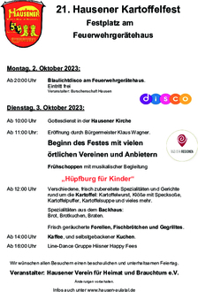 Allen großen und kleinen Besucherinnen und Besuchern wünsche ich unterhaltsame und fröhliche Stunden auf dem Festplatz und hoffe, wir sehen uns auf dem 21. Hausener Kartoffelfest.