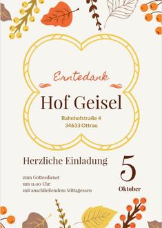 | 11:00 Uhr | Gemeinsamer Open Air Gottesdienst zum Erntedankfest auf dem Hof der Familie Geisel in Ottrau, Bahnhofstr. 4 - anschließend gemeinsames Mittagessen |