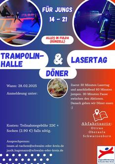 Einen unvergesslichen Tag voller Spaß und Action bietet die Jugendförderung des Schwalm-Eder-Kreises am 8. Februar für alle Jungs von 14 bis 21 Jahren aus Ottrau, Oberaula und Schwarzenborn an. Auf dem Programm steht ein Ausflug in die Trampolin- und Lasertaghalle in Künzell.