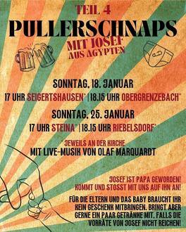 Am Sonntag, den 18. Januar, und am Sonntag, den 25. Januar, findet zum vierten Mal unser jährlicher Pullerschnaps mit einer Vaterfigur aus der Bibel statt. Diesmal mit Josef aus Ägypten. Am 18. findet er um 17:00 Uhr in Seigertshausen und um 18:15 Uhr in Obergrenzebach statt, jeweils vor der Kirche. Am 25. Januar dann um 17:00 Uhr in Steina und um 18:15 Uhr in Riebelsdorf, auch jeweils vor der Kirche. Bei Lagerfeuer und zu Live-Musik von Olaf Marquardt erzählt Daniel Richebächer die Geschichte von Josef, der im fremden Ägypten Vater wurde. Dann wird auf dessen Vaterschaft angestoßen. Alkoholische und nichtalkoholische Getränke gibt es vor Ort. Gerne darf aber zusätzlich etwas mitgebracht werden