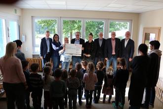 Spendenübergabe v.l.n.r. Klemens Olbrich (Aufsichtsratsvorsitzender WSB), Christiane Hahn (Leiterin Kindertagesstätte „Villa Kunterbunt“), Kerstin Brosch (Leiterin Kindergarten „Sausewind“ Riebelsdorf), Hannah Sehrig (Leiterin Kindergarten Klingelbach), Bürgermeister Marian Knauff, Heinz Schröder, Walter Kripko u. Thorsten Hofmann (Vorstand WSB), im Vordergrund Erzieherinnen und Kinder des Kindergartens „Sausewind“