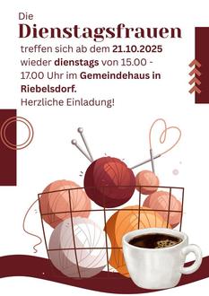Die Dienstagsfrauen treffen sich ab dem 21.10. wieder dienstags von 15.00 bis 17.00 Uhr im Gemeindehaus in Riebelsdorf.