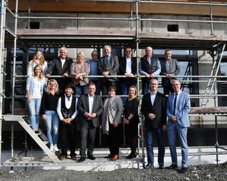 : (hintere Reihe v. li.): Constanze Gläser (Kreistag), Hilmar Löber (Kreisausschuss), Veronika Backes (Kreisausschuss), Gerd Höfer (Kreistag), Helmut Balamagi (Kreisausschuss), Bürgermeister Marian Knauff, Jürgen Lepper (Kreistag), Holger Raude (Leiter Hochbauverwaltung), (untere Reihe v. li.) Wiebke Knell (Kreistag/Landtag), Sandra Fröhlich (Hochbauverwaltung), Kai Laumann (Geschäftsführer Fa. Laumann), Landrat Winfried Becker, Schulleiterin Claudia Walz, Hannah Sykala (Staatliches Schulamt), Mike Stämmler (Leiter Schulverwaltung) und Stephan Uhde (Leiter Staatliches Schulamt)