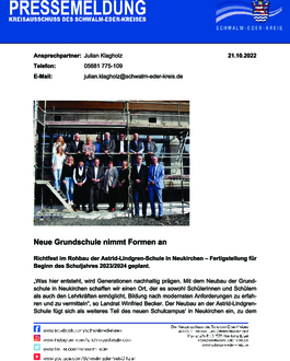 Und auch Bürgermeister Marian Knauff brachte zum Richtfest seine Freude über den Neubau der Grundschule zum Ausdruck: „Wir bekommen hier in Neukirchen eine neue und moderne Grundschule, dafür möchten wir uns als Stadt beim Landkreis als Schulträger bedanken. Der Neubau an der Astrid-Lindgren-Schule wird den Schulstandort Neukirchen noch einmal deutlich aufwerten und bietet den Kindern künftig ein optimales Lernumfeld.“