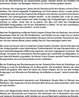 Material- und Lieferengpässen korrigiert werden. „In der aktuellen Zeit, in der so vieles ungewiss ist, ist es sehr schwer eine valide Aussage über Fertigstellungen von Baumaßnahmen zu treffen. Unser Ziel ist es jedoch, den Bau zum Start des Schuljahres 2023/2024 fertigzustellen und für den Schulbetrieb zu öffnen. Ich bin sehr optimistisch, dass wir dieses Ziel auch erreichen“, so der Landrat.