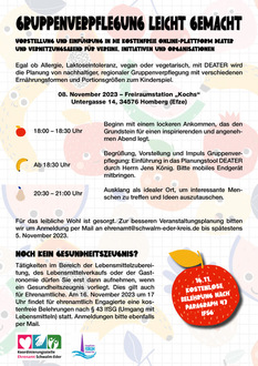 Am 08.11.23 laden die Koordinierungsstelle Ehrenamt und das Evangelische Forum Schwalm-Eder ab 18 Uhr in die Freiraumstation Kochs in Homberg ein. Unter dem Veranstaltungstitel „Gruppenverpflegung leicht gemacht“, wird die kostenfreie Online-Plattform DEATER vorgestellt. Egal ob Allergie, Laktoseintoleranz, vegetarisch oder auch vegan, mit DEATER wird die Planung nachhaltiger, regionaler Gruppenverpflegung mit verschiedenen Ernährungsformen und Portionsgrößen zur echten Zeitersparnis. Das Rahmenprogramm bietet tolle Vernetzungsmöglichkeiten für Vereine, Initiativen und Organisationen.