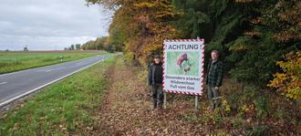 Mit dieser Aktion wollen die beiden Pächter auf die hohe Anzahl an Wildunfällen durch überhöhte Geschwindigkeit an Gefahrenpunkten (Wald - Feld-/Wiesenwechsel) hinweisen, die in jedem Jahr bei etlichen Verkehrsteilnehmern Blechschäden oder Schlimmeres verursachen und vielen Tieren das Leben kosten.