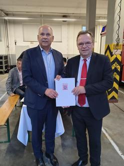 „Alle guten Dinge sind drei!“ Denn gleich drei Bewilligungsbescheide übergab am Freitag, 07. November 2025, der Hessische Innenminister Prof. Dr. Roman Poseck am Feuerwehrstützpunkt in Homberg (Efze). Bürgermeister Dr. Nico Ritz bedankte sich herzlich beim Hessischen Innenminister für die Unterstützung bei den zukünftigen Herausforderungen in den Bereichen Feuerwehr und Sicherheit. Denn gleich zwei Bescheide erhielt Dr. Nico Ritz für die Stadt Homberg (Efze) und Landrat Winfried Becker einen für den Schwalm-Eder-Kreis. Die zwei Bescheide für die Stadt Homberg enthalten Bewilligungen für ein Tank Löschfahrzeug 4000 an die Freiwillige Feuerwehr Homberg (Efze) (TLF) und für eine interkommunale Zusammenarbeit im Bereich „Sicherheit bei Veranstaltungen“ (IKZ). In dieser IKZ engagieren sich die Stadt Homberg (Efze), Neukirchen (Knüll) und Schwarzenborn sowie die Gemeinden Frielendorf, Oberaula und Ottrau. Der Landkreis erhält eine Förderung für ein Präventionsprojekt. „Mit den drei Förderungen stärken wir die Sicherheit im Schwalm-Eder-Kreis“, sagte der Hessische Innenminister Prof. Dr. Roman Poseck.
