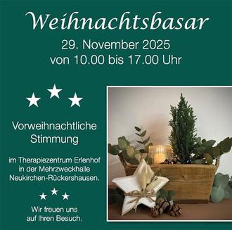 Stimmen Sie sich wieder mit dem Team der Pflege- und Therapieeinrichtung Bischoff auf die Adventszeit ein. Sie sind herzlich eingeladen, eine Tradition zu erleben und in die weihnachtliche Mehrzweckhalle des Therapiezentrums Erlenhof in Neukirchen-Rückershausen zu kommen.