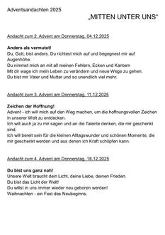 | 19.30 Uhr | Adventsandacht „Anders als vermutet!“ in der Pfarrscheune mit Anne Kahl und Team |
