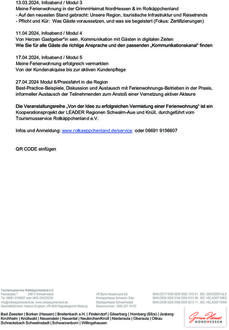 Die Veranstaltungen finden jeweils von 18.00 -20.00 Uhr an wechselnden Orten statt, eine verbindliche Anmeldung ist notwendig. Informationsabende können auch einzeln gebucht werden. Die Auftaktveranstaltung ist kostenfrei. Bei allen weiteren Veranstaltungen ist die Teilnahme für Mitglieder des Tourismusservice Rotkäppchenland kostenfrei, Nicht-Mitglieder zahlen jeweils 15,00 €