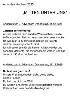 | 19.30 Uhr | Adventsandacht „Zeichen der Hoffnung!“ in der Pfarrscheune mit Anne Kahl und Team |