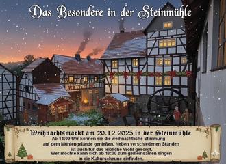 Schon von weitem erstrahlt das festlich illuminierte Mühlengelände - ein stimmungsvoller Auftakt für den zweiten Weihnachtsmarkt in der Steinmühle. Zehn Jahre nach seiner Premiere lädt der Förderverein Steinmühle am 20. Dezember erneut zu einem vorweihnachtlichen Nachmittag und Abend auf das historische Gelände ein.