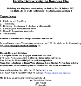 Im Anschluss an unsere Versammlung nehmen wir ab 19:30 Uhr wieder an der Versammlung der Forstbetriebsgemeinschaft Homberg teil.