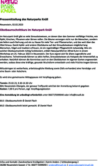 Im Naturpark Knüll gibt es viele Streuobstwiesen, an denen über den Sommer vielfältige Früchte, wie Äpfel, Kirschen, Pflaumen oder Birnen reifen. Die Bäume versorgen nicht nur die Menschen, sondern sie liefern auch Nahrung und ein zu Hause für viele Tier- und Pflanzenarten, und das weit über das Obst hinaus. Damit Apfel- und andere Obstbäume auf den Streuobstwiesen möglichst lang Menschen, Vögel und Insekten erfreuen, ist ein regelmäßiger Pflegeschnitt notwendig. Wie ein solcher Obstbaumschnitt richtig funktioniert, erklärt Naturparkführer Alfred Kuhn in einem Workshop am 25. Februar 2023 in Neuenstein. Der Kurs eignet sich für ältere Jugendliche und Erwachsene. Teilnehmende können so aktiv helfen, Streuobstwiesen als Hotspots der Artenvielfalt zu erhalten. Natürlich können die Kenntnisse auch an den Obstbäumen im eigenen Garten angewendet werden, sodass diese eine kräftige, gesunde Wuchsform entwickeln und viele Früchte tragen können.