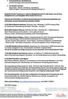Die Veranstaltungen finden jeweils von 18.00 - 20.00 Uhr statt, Praxisfahrt 09.00 -13.00 Uhr. Eine verbindliche Anmeldung ist notwendig. Informationsabende können auch einzeln gebucht werden. Die Auftaktveranstaltung ist kostenfrei. Bei allen weiteren Veranstaltungen ist die Teilnahme für Mitglieder des Tourismusservice Rotkäppchenland kostenfrei, Nicht-Mitglieder zahlen jeweils 15,00 €
