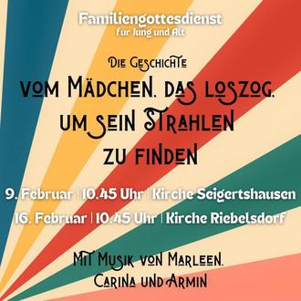 Im Kirchspiel an der Steinafurt laden wir ein zu einem besonderen Familiengottesdienst - am Sonntag, den 9. Februar, in der Kirche Seigertshausen und am Sonntag, den 16. Februar in der Kirche Riebelsdorf - jeweils um 10.45 Uhr. Darin geht es um ein Mädchen aus einem grauen Land, das sich auf die Suche nach seinem Strahlen macht. Auf seiner Reise begegnet es interessanten Gestalten. Kommt mit auf diese spannende Reise, die mit Livemusik von Marleen Honisch, Carina Kranz und Armin Honisch aus Seigertshausen untermalt wird. Mit den Gottesdienst wollen wir nicht nur Kinder, sondern ebenso Jugendliche und Erwachsene ansprechen... Es ist ein Gottesdienst für alle! Herzlich willkommen!
