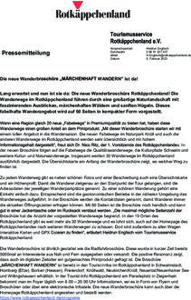 Die Wanderbroschüre ist ähnlich gestaltet wie die Radfahrbroschüre. Diese wurde in kurzer Zeit bereits 5000mal an Interessierte aus Nah und Fern ausgegeben oder versandt. Die positive Resonanz zeigt, dass auch im digitalen Zeitalter ein gutgemachtes Printprodukt gefragt ist. Die Broschüre „MÄRCHENHAFT WANDERN“ ist bereits in den Tourist-Infos im Rotkäppchenland in Schwalmstadt, Homberg (Efze), Borken (Hessen), Frielendorf, Knüllwald, Neukirchen/Knüll, Neuental/Neuenhainer See und Willingshausen erhältlich. In der Tourist-Info Rotkäppchenland am Paradeplatz in Ziegenhain bekommt man im Foyer täglich von 8.00 – 20.00 Uhr Informationen, sei es in Form von Flyern und Broschüren oder über eine elektronische Infostele. Die neue Wanderbroschüre kann auch über die Homepage Rotkäppchenland angesehen und bestellt werden: https://www.rotkaeppchenland.de/prospekte