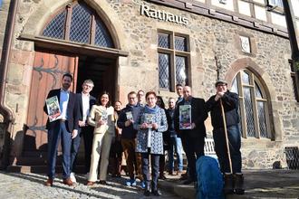 Der Vorstand des Tourismusservice Rotkäppchenland freut sich mit der Geschäftsführerin über die neue Wanderbroschüre