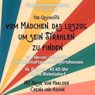 | 10.45 Uhr | Riebelsdorf | Familiengottesdienst „von dem Mädchen, das loszog, um sein Strahlen zu finden“ mit Pfarrer Richebächer und CAVIAR-Music |