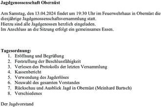 Am Samstag, den 13.04.2024 findet um 19:30 Uhr im Feuerwehrhaus in Obernüst die diesjährige Jagdgenossenschaftsversammlung statt.