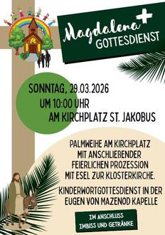 | St. Jakobus | 10:00 Uhr | Magdalena-Plus-Gottesdienst der ganzen Pfarrei Palmweihe am Kirchplatz mit anschl. Palmprozession zur Klosterkirche mit festlicher Chor- und Orchestermusik es singt der Kirchenchor St. Jakobusfür Klara u. Oskar Sauer u. leb. u. verst. Angeh. |