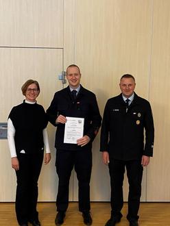 v.l.n.r: Bürgermeisterin Marion Frohnapfel, Wehrführer Lukas Laibach und stellv. Leiter der FF Justus Beier