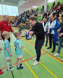Mittendrin: Frederik Schmitt, Sportdezernent und Erster Kreisbeigeordneter des Landkreises Fulda, der sich Zeit nahm, die jungen Talente persönlich zu sehen - und ihnen die verdienten Medaillen überreichte. Auch Bürgermeisterin Marion Frohnapfel machte sich persönlich einen Eindruck vom neuen Kinderfußball.