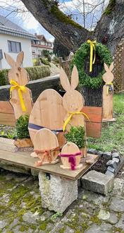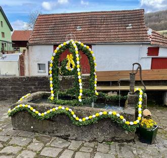 Das Brunnen-Team hat den örtlichen Brunnen in der Kreuzbergstraße nicht nur mit immergrünen Bruchs, sondern auch liebevoll mit kleinen und großen Eiern sowie mit Osterhasen dekoriert.