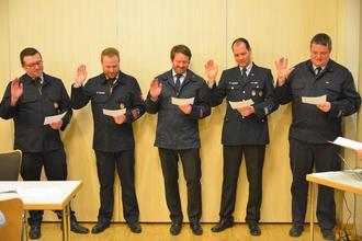 Zunächst wurden die neu gewählten Wehrführer und stellvertretenden Wehrführer (v.l.n.r.) Markus Weber und Benjamin Baier (beide Rimmels), Benedikt Beier und Paul Weber (beide Hofaschenbach) sowie Michael Vieth (Silges) durch die Bürgermeisterin förmlich ernannt und in das Ehren-Beamtenverhältnis auf Zeit berufen.
