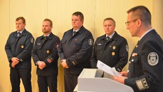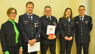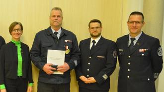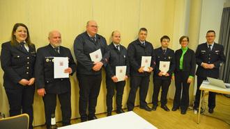 Für besondere Verdienste um den Brandschutz wurden Thorsten Hohmann (2. v.l.) und Georg Vieth (3. v.l.) mit dem Silbernen Brandschutzverdienstzeichen am Bande ausgezeichnet.