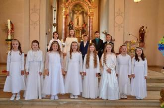 In den vergangenen Monaten haben sich 13 Kinder der Gemeinde Nüsttal auf ihre Erstkommunion vorbereitet. Am 23. April 2023 war der lang ersehnte Tag gekommen. Bei tollem Wetter und mit bester Laune empfingen die Kinder zum ersten Mal ihre Kommunion in der Pfarrkirche St. Peter und Paul in Hofaschenbach.